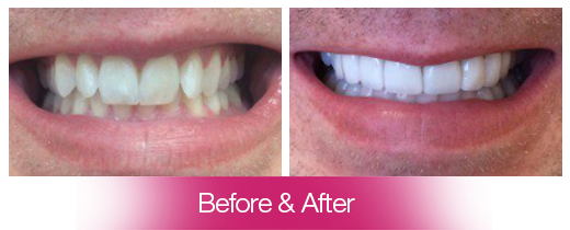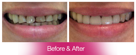 Six veneers on upper teeth were placed to correct the spacing and severe wear facets caused by nighttime grinding.